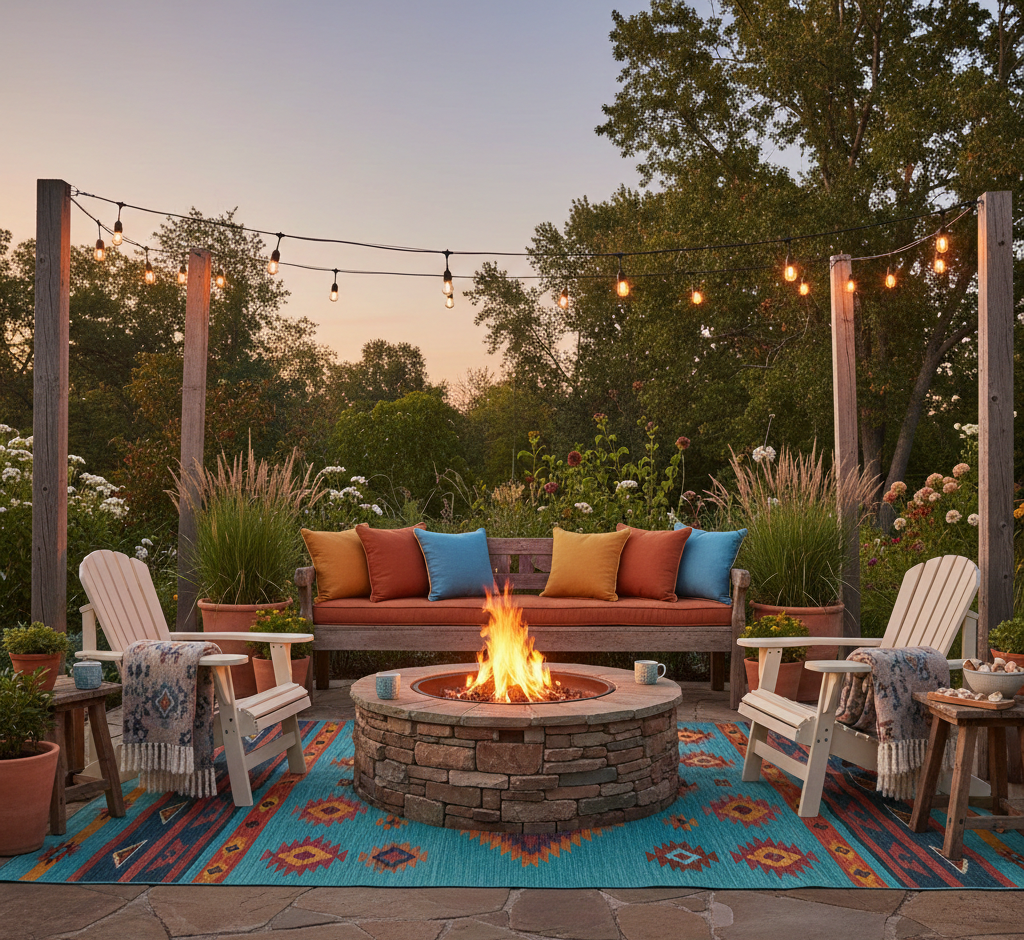 Add a splash of color and comfort with outdoor rugs. A vibrant, weather-resistant rug can delineate your fire pit decor area, making it feel more like an outdoor living room. Incorporate patterns that complement the surroundings and add plush outdoor cushions for extra coziness, enhancing your overall fire pit decor.